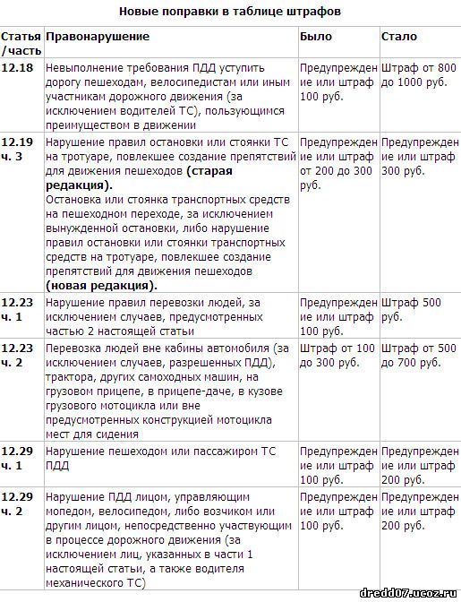 Наиболее радикальными стали изменения в статье 12.18, которая наказывает за “невыполнение требования ПДД уступить дорогу пешеходам, велосипедистам или иным участникам дорожного движения (за исключением водителей ТС), пользующимся преимуществом в движении”. Так, в графе “наказание” слова “предупреждение или” в новой редакции исключили, а штраф в 100 руб. заменили на более внушительное денежное взыскание: “от восьмисот до одной тысячи”. Между тем финансовое наказание за нарушение ПДД пешеходом или велосипедистом повысилось с 100 до 200 руб. Как пояснил в беседе с AutoNews.ru представитель ГИБДД, который захотел остаться неназванным, подобная разница в размерах штрафов вызовет справедливое возмущение среди водителей, особенно в крупных мегаполисах.