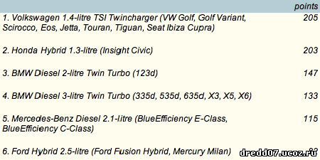 Ожесточенная борьба в номинации “Зеленый двигатель года”, которая в наше время вполне справедливо может считаться одной из важнейших, также закончилась победой 1,4-литрового монстра. Многие ожидали увидеть в победителях дизельный двигатель или какой-нибудь гибрид, но в этом году пришло время VW и его 1.4 TSI Twincharger, который, набрав 205 баллов, смог опередить гибридную 1,3-литровую установку от Honda с еще меньшим перевесом в два балла. Хотя победа нового чемпиона и не удивительна – этот мотор сочетает отличную экономию топлива с довольно внушительными мощностными характеристиками, что всегда будет в почете.