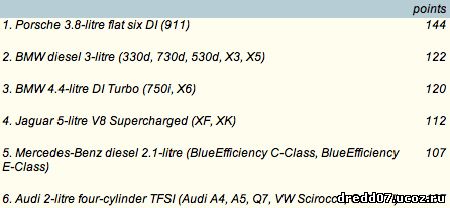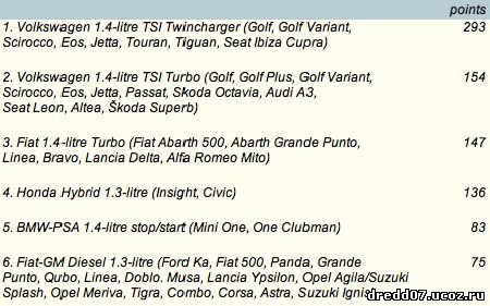 Не будем откладывать главный сюрприз на потом, а сразу порадуемся за VW и его 1,4-литровый двигатель TSI Twincharger, который неожиданно смог положить на лопатки не только BMW, триумфатора последних четырех лет, но и конкретно трехлитровый битурбомотор, побеждавший в 2007 и 2008 годах. Помимо этого малыш установил и еще один рекорд, ведь отрыв от второго места составил всего-то четыре балла. И это при том, что победитель смог собрать 354 балла. Но это был еще не конец, ведь триумфатора хватило и еще на один подвиг.